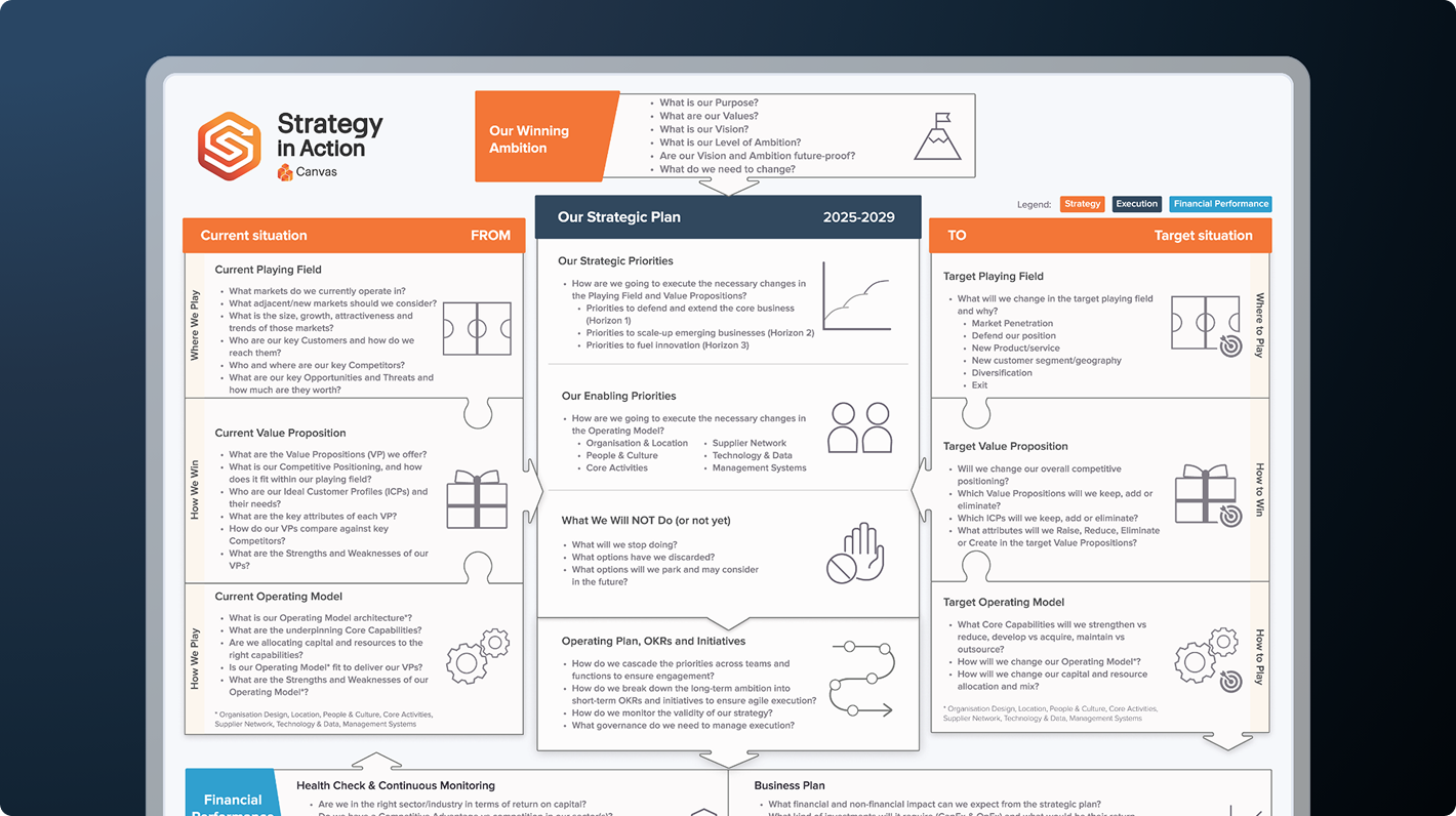 We turn strategy into a living system through a powerful blend of enterprise software, AI-driven insights, and hands-on facilitation from experienced strategy professionals.